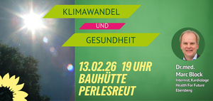 Gerne laden wir euch herzlich zu einem spannenden Vortragsabend zum Thema „Klimawandel und Gesundheit“ ein. Am Freitag, den 13.02.2026 um 19:00 Uhr wird Dr. med. Marc Block, Internist und Kardiologe (Health For Future Ebersberg), in der Bauhütte Perlesreut darüber sprechen, wie sich die Klimakrise auf unsere Gesundheit auswirkt und welche Handlungsmöglichkeiten wir vor Ort haben.