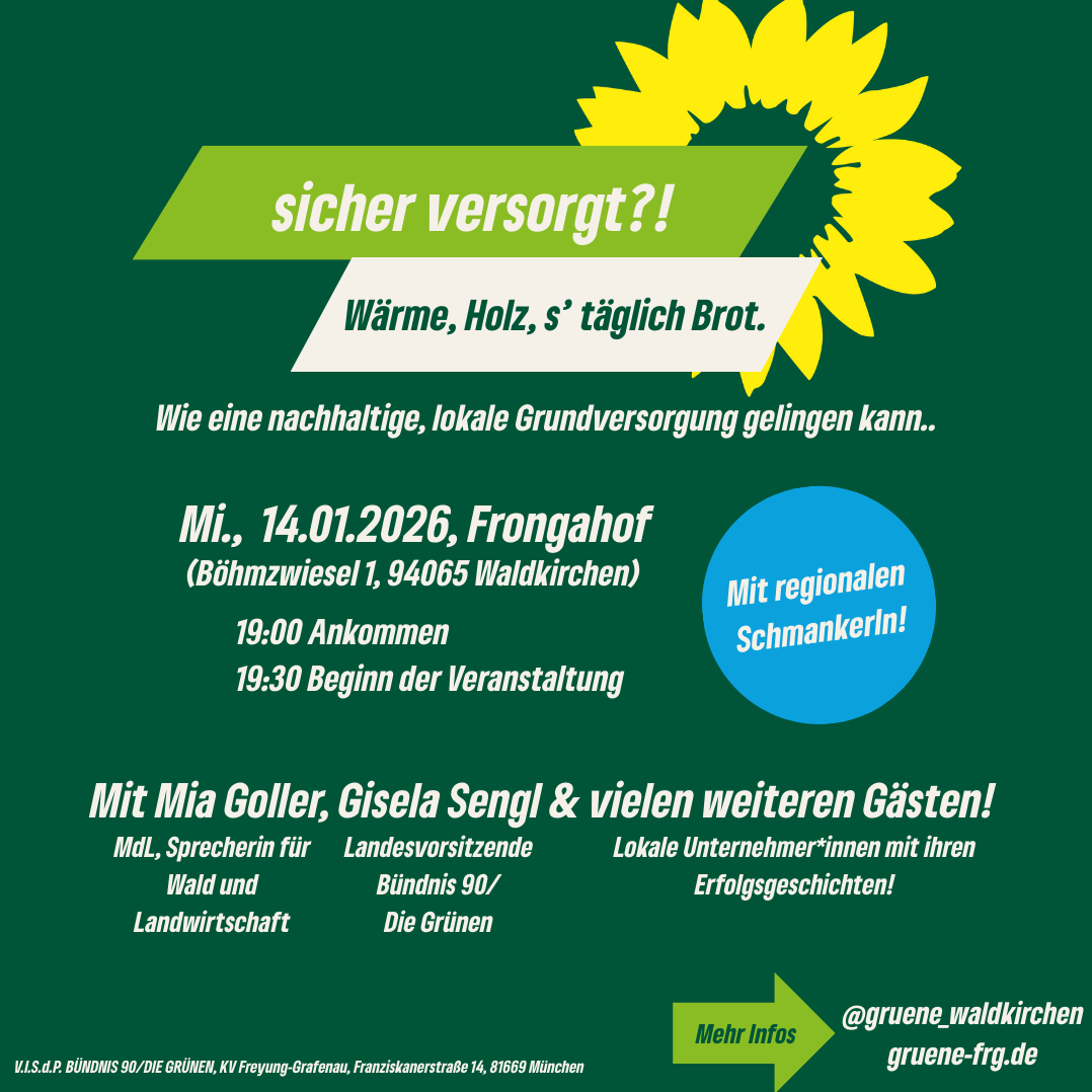 Unser Herz schlägt für die Natur und die Menschen im Bayerischen Wald. Wir gestalten eine nachhaltige und zukunftsfähige Region – vom Erhalt der Wälder bis hin zu sozialer Gerechtigkeit. Gemeinsam mit dir wollen wir Freyung-Grafenau grün, lebendig und zukunftssicher machen. Sei dabei!