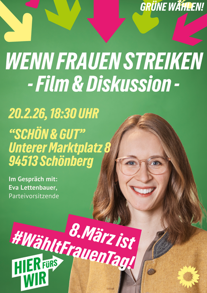 Am 20. Februar laden wir um 18:30 Uhr ins „Schön & Gut“ in Schönberg zu einem besonderen Filmabend mit anschließender Diskussion ein. Im Mittelpunkt steht ein aktueller Dokumentarfilm über einen Tag, an dem Frauen ihre Arbeit niederlegen, um sichtbar zu machen, wie viel sie täglich leisten und welche Folgen strukturelle Ungleichbehandlung hat. Im Anschluss sprechen wir mit der Vorsitzenden der bayerischen Grünen Eva Lettenbauer über die politische Bedeutung eines solchen „Frauenstreiks“, aktuelle feministische Forderungen und die anstehende Wahl am 8. März, dem Internationalen Frauentag. Der Eintritt ist frei, eine Anmeldung ist nicht erforderlich.